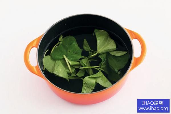 地瓜葉摘成一段段後沖洗並稍微浸泡。