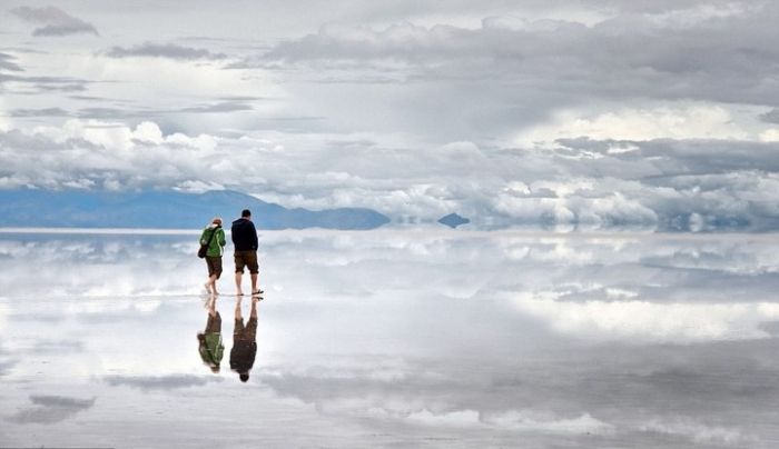 這裡是一片天然形成的鹽沼,面積達到4,086平方英里,是目前世界上最大的鹽沼地形。當雨季一來,整個地面上蓄積着一層薄薄的雨水,形成一個完美的反射鏡面,將美麗的藍天白雲完美地反射在地面上。走在上面,就像是漫步在雲端的感覺,簡直像是在夢境中一樣。