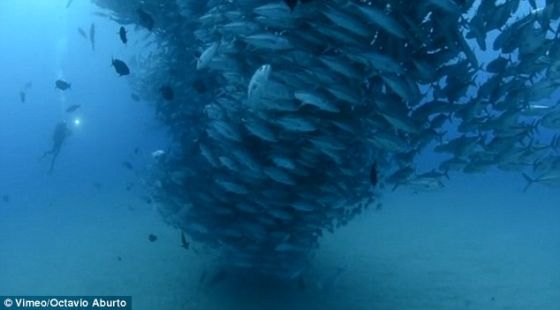 攝影師阿布爾托捕捉到他的朋友兼同是潛水者的卡斯特羅正謹慎靠近這個旋轉運動的巨大魚群。