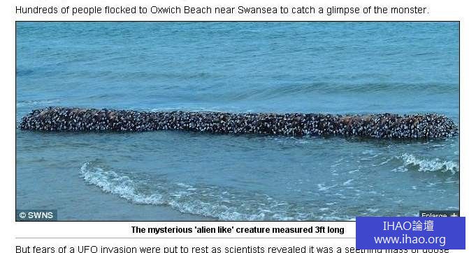 當人們開始設想這種未知生物可能來自外星球的時候,專家的解釋很快揭開了謎團。這實際上只是海底的鵝頸型籐壺,惡劣的天氣將它們沖刷至海灘上。這些節肢動物長長的觸角本來是在海底尋覓食物的,現在卻緊緊地攀爬在一根圓木上。