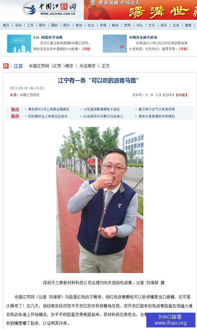鋪路用的瀝青是石油副產品,但南京最近卻出現一條「可以吃」的紅色瀝青馬路,將瀝青顆粒放進嘴裡,嚼起來像沒有味道的口香糖。據介紹,這樣的環保瀝青鋪設簡單、快捷,而且噪音很小。