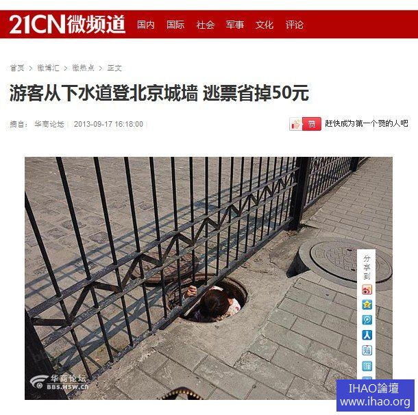 大陸新聞片段:「可這根本就擋不住遊客們逃票的決心,還有不少的女漢子,不、女遊客吧,也是義無反顧地,鑽進了下水道。」