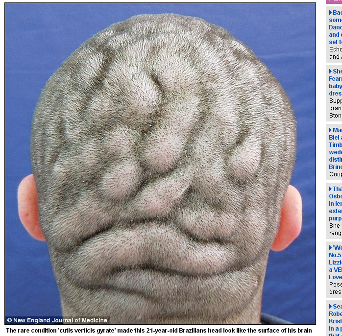 巴西一名21歲的男子得了一種相當罕見的疾病,他的頭皮並非像一般人一樣是平整的,而是莫名長出一層一層像是大腦外露般的皺褶,所幸這種疾病目前並沒有對他造成明顯影響,也不會造成智力衰退;這名男子對於頭皮特殊皺褶也感到相當自豪。