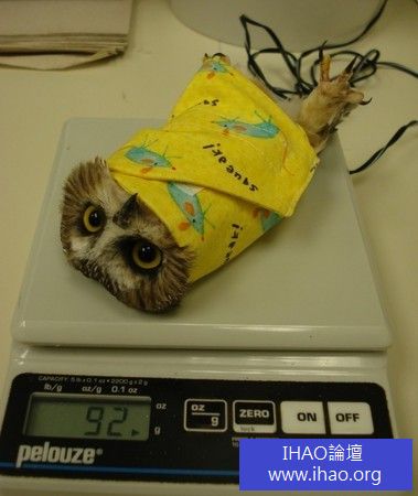 你知道貓頭鷹是如何量體重的嗎?美國明尼蘇達州大學猛禽中心去年10月連續收留了15多隻的「北方鋸磨貓頭鷹」(Northern saw-whet owls),其中大多是因為受傷才會被送到中心治療,為了知道牠們的身體狀況,中心人員也會幫牠們穿上特殊的衣服,包成「貓頭鷹捲餅」放到體重計上測量體重。