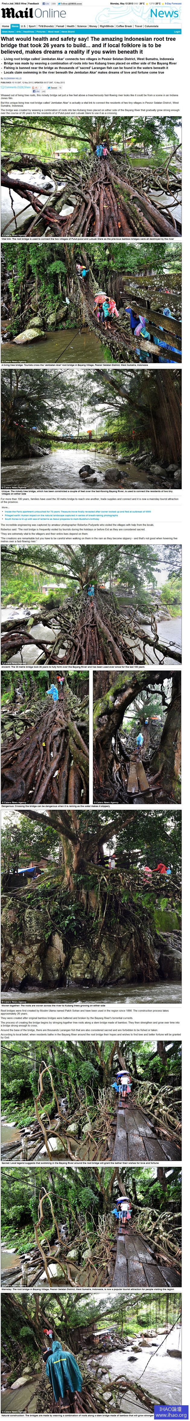 英國「每日郵報」(Daily Mail)報導,位於柏希希爾行政區這座渾然天成的木橋是由巴揚河(BayangRiver)兩岸大樹的樹根交織而成,離水流湍急的河面僅數公尺。