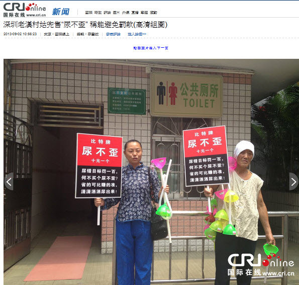 深圳城管部門實施新規定,民眾上公廁「尿歪」要罰100元(人民幣,下同)。而街頭出現一對男女,背著數十個膠塑製品「尿不歪」,聲稱是在配合執法,向上廁所的人叫賣。