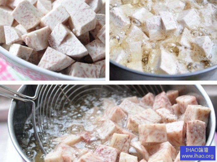 1先將芋頭切丁狀,再下油鍋至芋香釋放出(炸約5~6分鐘),撈起備用