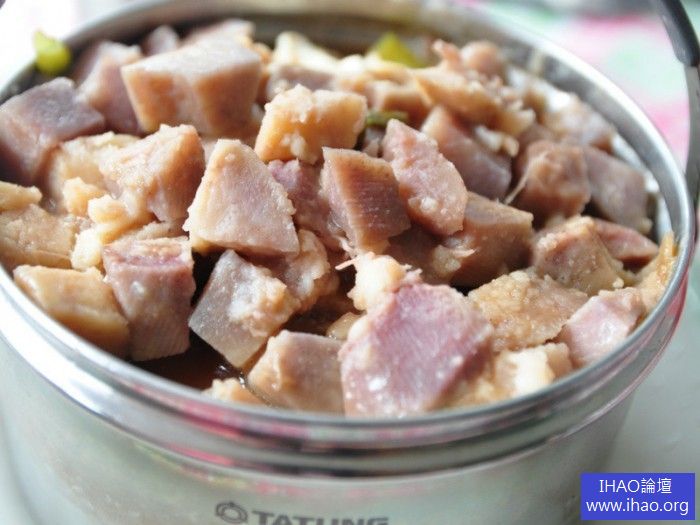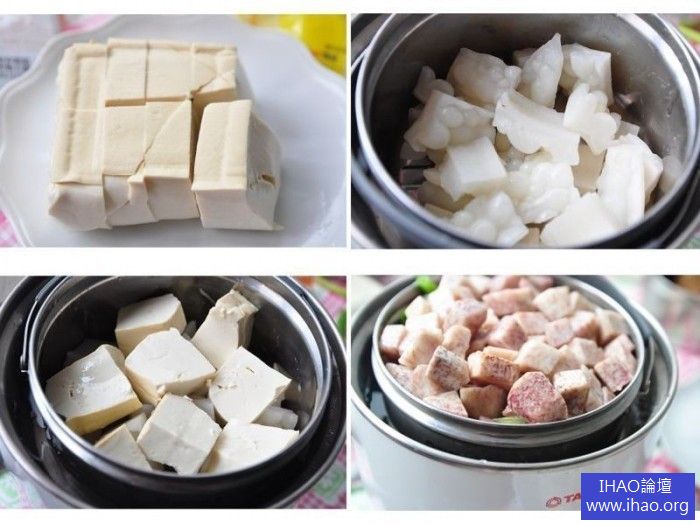 3另外再準備一塊家常豆腐切片,放入大同小Q鍋,底層放苦瓜片、中層放入加長豆腐(剩餘食材利用)、最上層則放入芋頭丁及蔥段,外鍋放1量杯水(芋頭千萬不要放在最下層,容易燒焦)