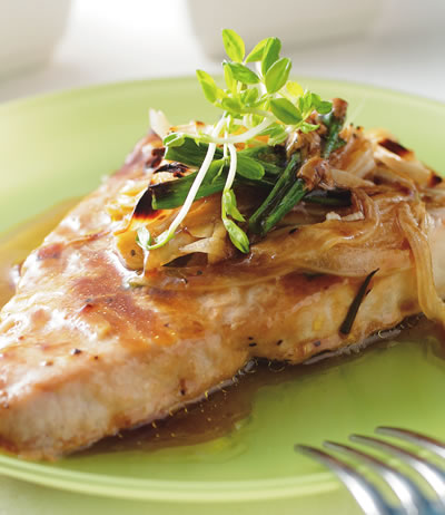 2.將照燒醬均勻抹在作法1的旗魚上,再放上洋蔥絲、青蔥段和蒜片,放入已預熱的烤箱中,以上火190℃下火190℃烤10分鐘至外觀略上色即可取出盛盤。