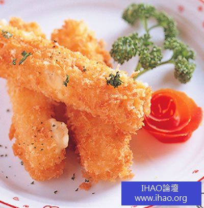 2.將長型熱狗薄片放在起士片上捲起來,依序沾裹低筋麵粉、打散的蛋汁、麵包粉備用。