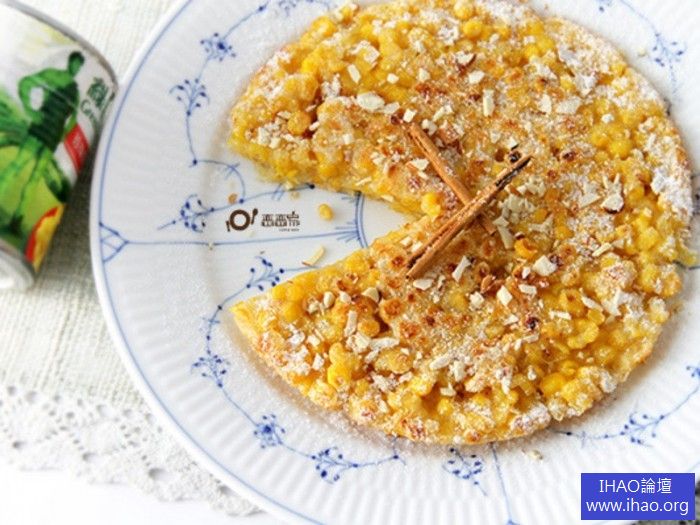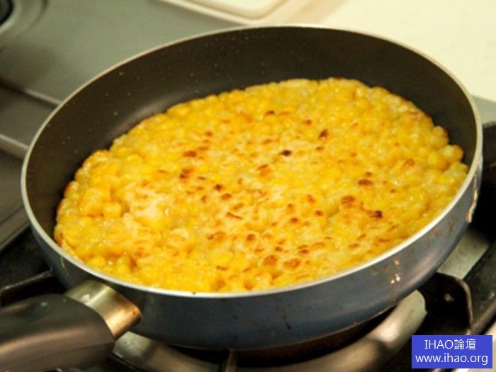 3準備一只平底鍋,將玉米糊平鋪在鍋上,兩面煎成帶有金黃色即可起鍋(因玉米粒是熟食,所以只要煎一下下就可以啦)