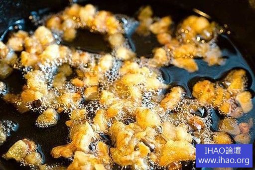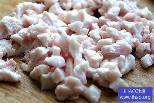 將豬肥油切成小丁,越小越好。