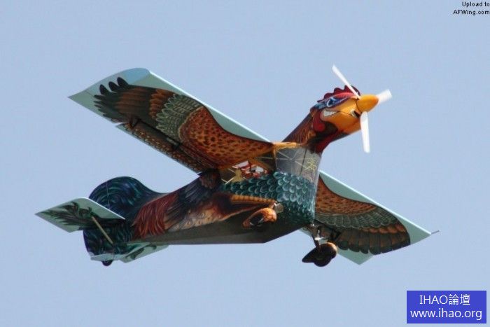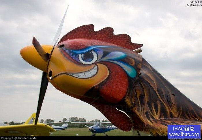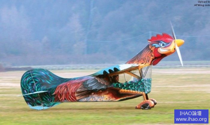 ttone的“飛雞”孵化於一張餐巾紙上,這大概是4年前在酒精作用下的一次酒吧打賭。“飛雞”100%原創設計,木製機翼,鋼管蒙布機身,大型垂尾,總之一切以模仿公雞為要務。雞頭和雞脖向前高高翹起,雞頭內安裝一台100馬力的Rotax 912發動機。“飛雞”的重點在於彩繪,在精心噴繪後完成了這件大型空中藝術品。“飛雞”的座艙在雞胸內,操縱機構完全顛覆傳統,因為操縱桿是從頂部往下垂的,前推爬升後拉俯衝。