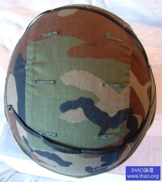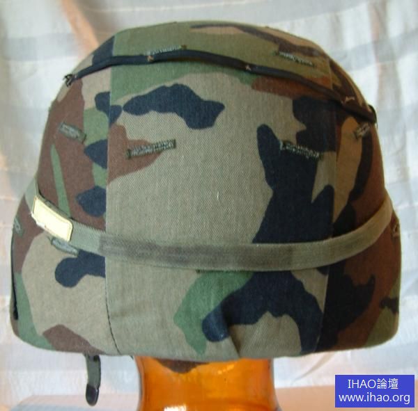 盔罩安裝在頭盔上的樣子,另外注意顎帶的結構,左右都有一個帶扣。盔罩上口子用來插樹枝等偽裝物。盔罩由五塊布料縫製:中間一塊從前至後的長方形布料,兩側兩塊半圓形布料,另外還有兩片布料用於固定。最後兩片布料在圖中是無法看到的,因為被壓到內部,在最後的盔內視圖中可以看到