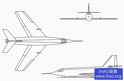 道格拉斯飛機公司研製的X-3 機長20.36 米,機高3.81 米,翼展6.92 米,其外形就像一把短劍,是早期X 系列試驗飛機中外形最流暢的。與X-1、X-2 不同,X-3 是藉助自身的動力起飛和降落,並能保持進行2 馬赫巡航飛行。X-3 機體結構首次嘗試大量使用鈦合金,同時還進行了低展弦比、高翼載機翼的可行性研究。X-3 的機身細長機翼短粗,這是當時美國正在研製中的戰鬥機的典型佈局。後來,F-104“星”戰鬥機的翼形就是取自X-3。