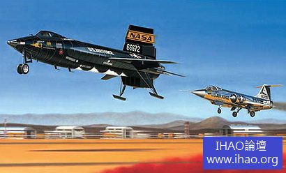 X-15 與伴飛的F-104 戰鬥機一起降落,清晰可見其後部的降落滑撬