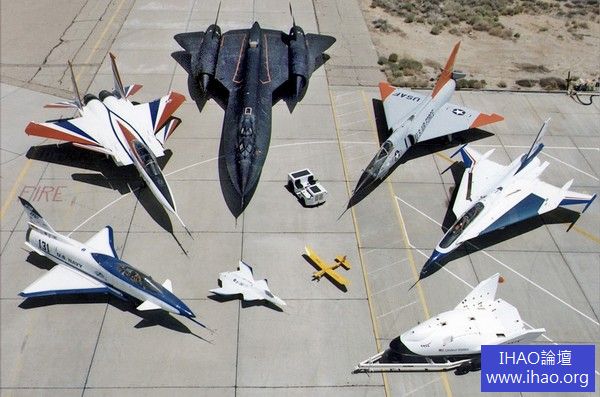 從左至右依次是X-31、F-15ACTIVE、SR-71、F-106、F-16XL、X-38、無線電控制載機和X-36