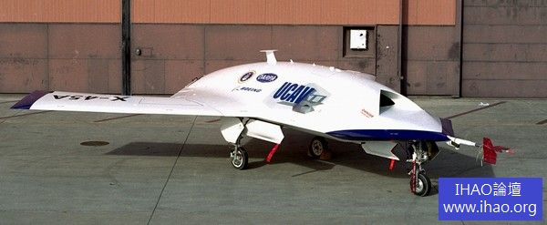 2002年5月22日,第一架X-45A在愛德華茲空軍基地完成了首次試飛。飛行總共持續了14分鐘,X-45A的其飛行速度達每小時360公里,飛行高度為2,280米。X-45A的此次飛行不僅標誌著美國UCAV計劃取得了初步的成功,也讓波音公司在JSF項目失敗後獲得了一次鼓舞人心的勝利。X-45A的無尾翼設計借鑒了於1996年首飛成功的X-36無人試驗機的設計,兩種機型的機翼外形十分相似,如機翼邊緣控制面和偏航向矢量排氣噴管等。不過兩者還是有很大區別的,如X-45A就要比X-36大許多,而且後者不具備自動駕駛能力(注:X-45A採用“人在迴路”(Man-in-the- Loop)控制,在其進入飛行的關鍵階段進行人為監控,這些工作可以在地面/艦船站、F-15E和F/A-18F等攻擊機或E-3和E-8指揮控制機上進行。 )。X-45A動力為一台霍尼維爾F124-GA-100渦扇噴氣發動機,其進氣口置於飛機的上方。X-45A機身內部有兩個武器彈艙,其中一個攜帶試驗設備,另一個則掛載一枚450千克中的JDAM炸彈或者6枚113千克炸彈。X-45A的試驗將在2004年達到頂點,屆時將演示多機控制、協調飛行、無人機間的通信、途中改變任務、合作瞄準和武器投放。