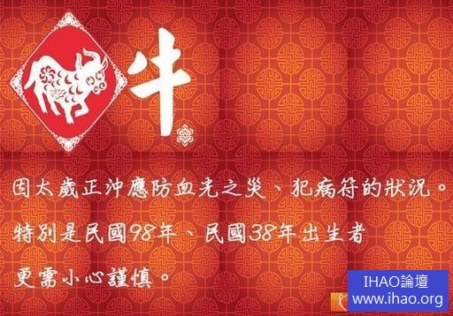 牛在十二地支中以地支為「丑」,亦屬土,除了在太歲中屬正沖外,由於2015「乙未」年,天干的「乙」屬木的關係,在木剋土的情況下,較容易出現血光之災,及犯病符的狀況發生。特別是民國98年、民國38年「己丑」年出生者,由於本命中天干及地支皆屬土,因此在「乙未」年中更需小心謹慎。