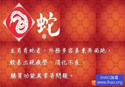 生肖肖蛇者在「乙未」年中,外務多容易東奔西跑,不僅較易出現疲勞、疲倦等不適症狀;在三餐飲食不定、作息不正常的狀況下,恐誘發消化不良、腸胃功能異常等問題!再加上犯天狗等因素,易有血光之災,所以日常生活、外出應多加謹慎。