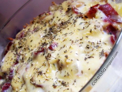 馬鈴薯上面放有火腿、玉米、鳳梨灑上碎巴西利、黑胡椒最後淋上招牌的起士醬