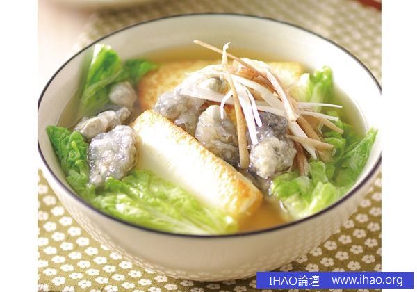 鮮蚵(牡蠣)200公克、豆腐75公克、牛蒡100公克、小白菜50公克、水適量。