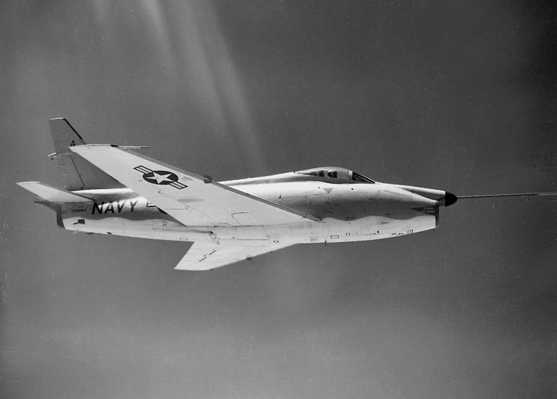 FJ-1時期還是平直翼,且沒有摺疊翼設計,在翼尖外掛油箱時的航程可達2,407公里
