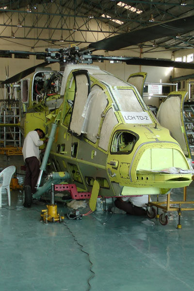 印度LCH武裝直升機是由印度斯坦航空有限公司(HAL)研製和生產的輕型武裝直升機,能夠在複雜氣候和天氣條件使用現代化武器執行作戰任務,該機裝備火箭吊艙、機關炮以及空對空飛彈,能夠擊落無人機和低速運動的飛行器、護送在特種作戰中運輸兵員的直升機,摧毀敵方防空、在城市環境中飛行以及炸燬坦克和其它車輛。以下圖片是LCH武裝直升機裝配線。