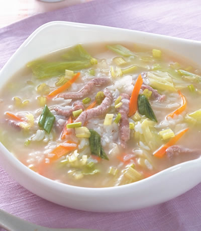 3.於作法2倒入水煮滾後,放入作法1的醃肉條,煮滾後放入白飯與鹽,煮至入味呈稠狀。