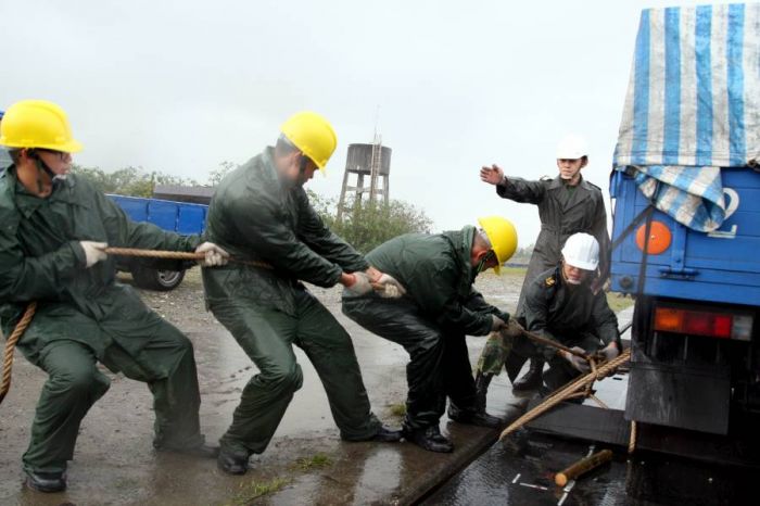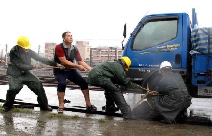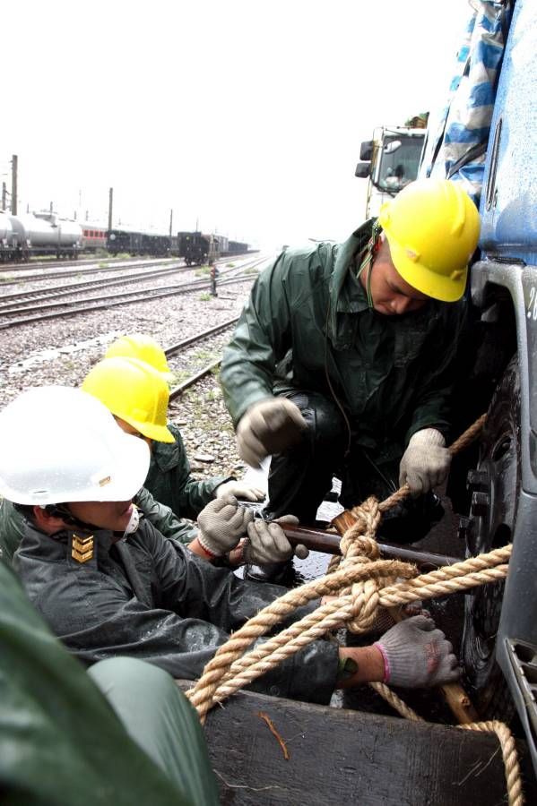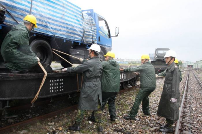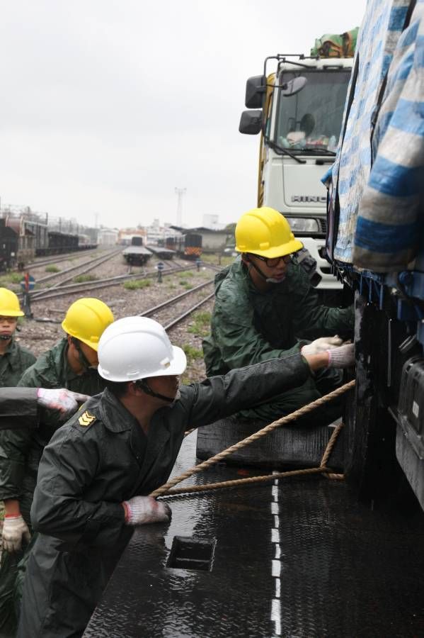 蘇花公路坍方中斷,國軍官兵自十四日起一連四天,協助花蓮地區農、漁民執行鐵路運輸平板車上貨車綑綁固定作業