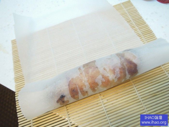 5將雞肉捲去除棉繩。放在耐熱保鮮膜或烘焙紙上。用壽司捲簾捲起,並用橡皮筋綁緊