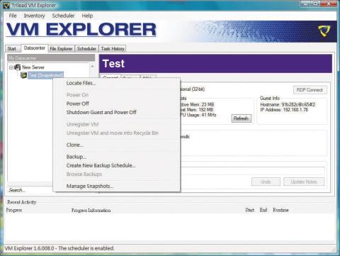和vCenter Converter相比,VM Explorer的功能較為單純,僅提供備份及重新部署的功能,不過它可以在虛擬機器啟動的情況下採取備份的動作,同時備份的範圍也涵蓋到先前所建立的各版本快照檔。