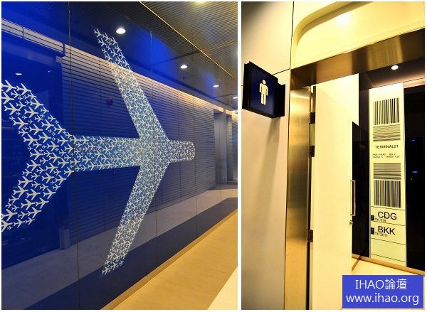 走出BTS的Asok站,我直通開幕一年多、久仰大名的「Terminal 21」,這間百貨的內部設計概念來自航空站,上扶梯要過登機門,活動看板是班機時刻表,連詢問處的櫃檯小姐也變裝空姐制服,彷彿來到機場一般。而各樓層的佈置,分別採用了不同國家、城市元素,遊客剛剛還在日本東京,轉眼置身英國倫敦,每登臨新樓面,就像造訪新國度,夠特別吧!不過讓我想也想不到的是,Terminal 21最「促咪」、最富設計巧思之處竟不在大庭廣眾眼皮下,卻是那最容易被忽略的解放之地--廁所!