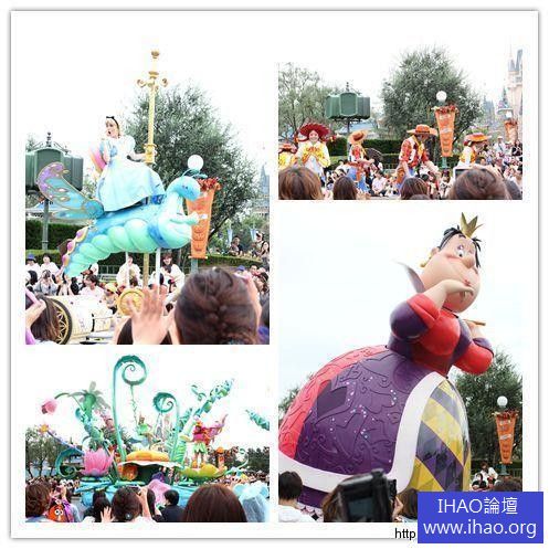 30周年慶的「幸福在這裡」遊行則是以傳遞幸福景象為主,迪士尼明星們各個乘坐色彩鮮豔的花車,由高飛狗乘著小馬打頭陣,迎面而來的除了米奇、米妮、唐老鴨、布魯托常見的迪士尼人物外,深受小朋友喜愛的人物像是迪士尼公主、小飛俠中的小精靈、維尼家族、海底總動員、玩具總動員等都陸續出現,輕快的音樂、搭上遊行舞者輕快的舞步、燦爛的笑容,都令人不禁心情雀躍了起來。