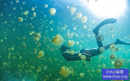 據人民網報導,澳大利亞攝影師戴維在帛琉的水母湖旅行時,捕捉到了這一幕。他說:『當Mikki勇敢地跳進這個滿是水母的湖中時,我大吃一驚。我知道水母是無害的,但看到有人穿這麼少直接與水母接觸,還是感覺怪怪的。』