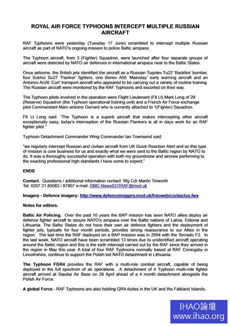 6月17日,英國皇家空軍颱風戰機攔截了從國際空域靠近波羅的海國家空域的俄羅斯多架軍機,包括兩架SU-27SK戰機(均滿載中距與近距格鬥武器)、一架加掛空對艦飛彈的TU-22M3轟炸機、一架A-50預警機、一架AN-26運輸機。