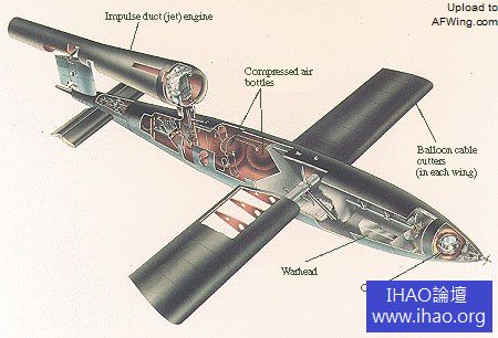 V-1 的陀螺和戰鬥部安裝在機頭,壓縮空氣罐安裝在後機身