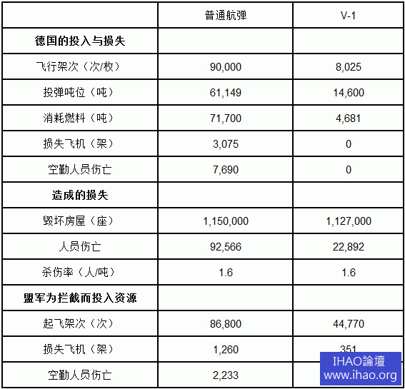 關於V-1 飛彈攻擊的最終效果如何,美軍​​少將Clayton Bissell 進行了統計分析,並與德軍早先使用轟炸機對英國進行轟炸的效果進行了比較,下表為比較結果: