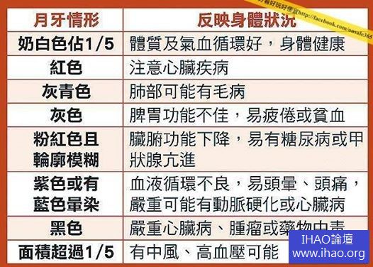 正常月牙面積佔指甲1/5,奶白色最好,健康男性月牙約0.3公分高,女性略小,面積從拇指、食指、中指等依次遞減,老人也較小,營養不良者則消失。