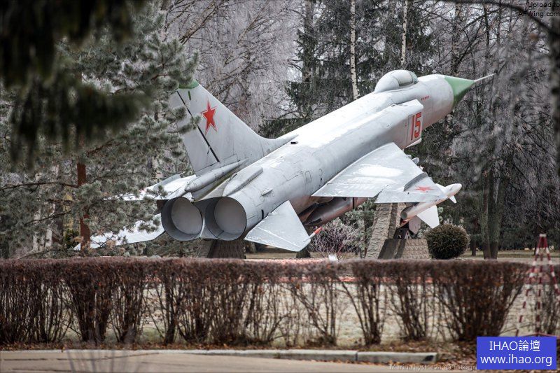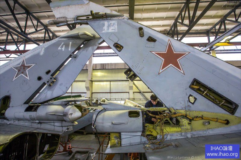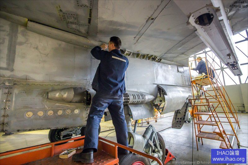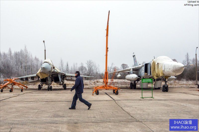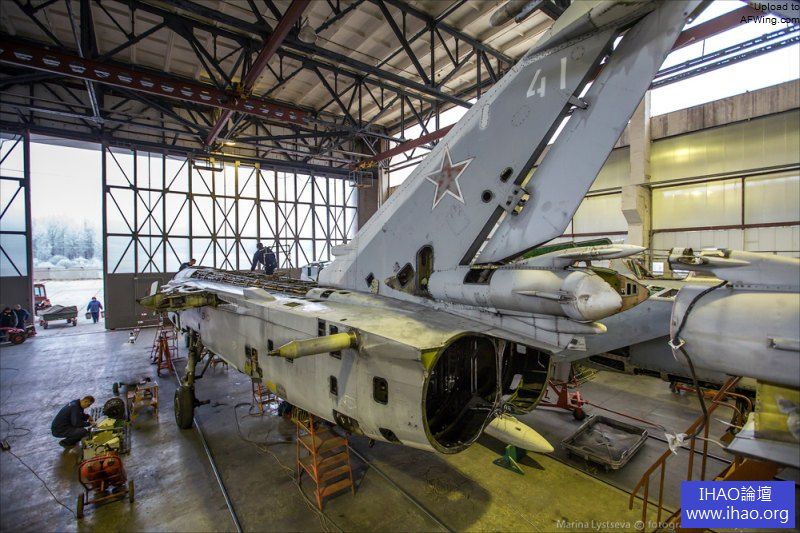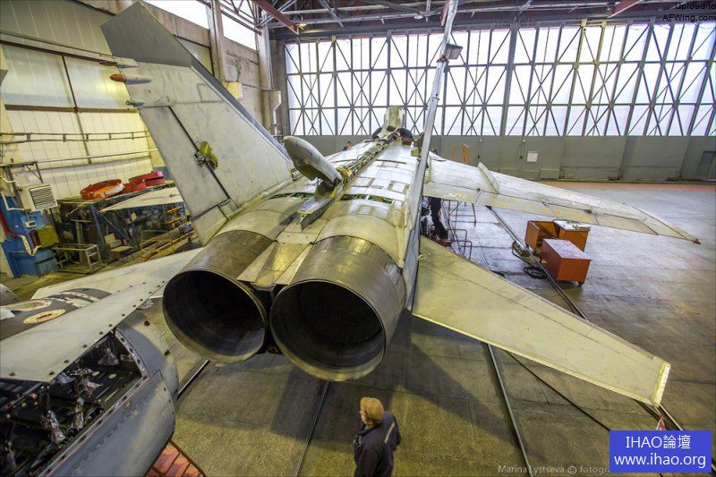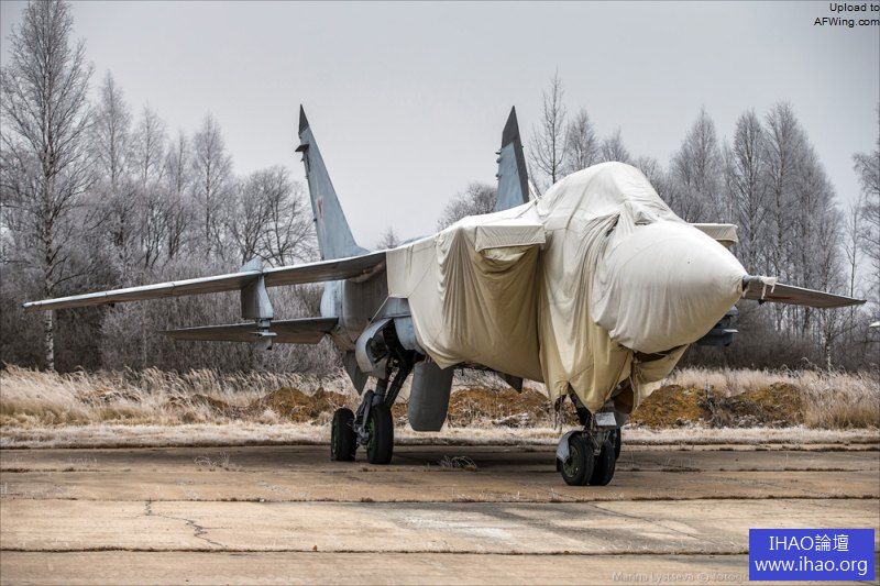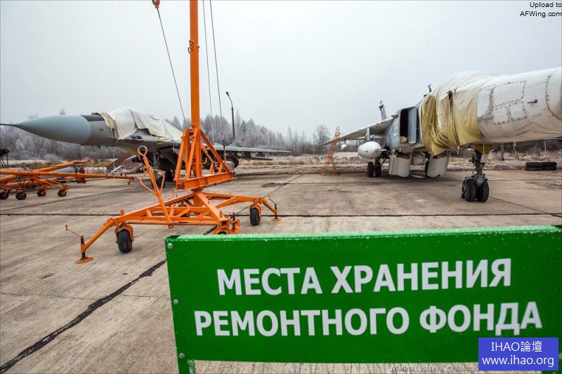 米格-31抵達後要用千斤頂支起來,抽乾液壓油。注意這架飛機的機徽還是蘇聯時期的式樣。