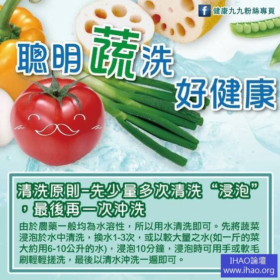 清洗蔬菜最好的方法是用水沖洗,使用鹽水浸泡對於清除農藥殘留並無助益,有些人習慣以清潔劑清洗蔬果,但清潔劑未清洗乾淨,又將造成其他化學物質的殘留,因此清水沖洗是最好的方法。