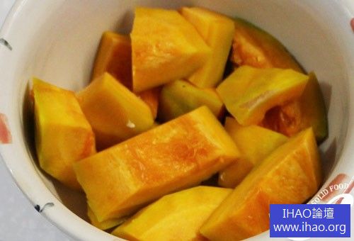 此時的南瓜,還是半生不熟的喔!!因為只是要讓南瓜好切好去皮,簡單用電鍋蒸軟。接下來,就看你要怎麼料裡啦!