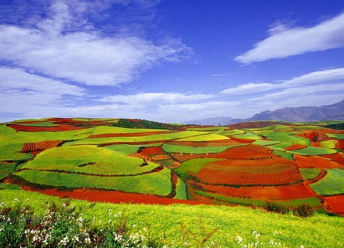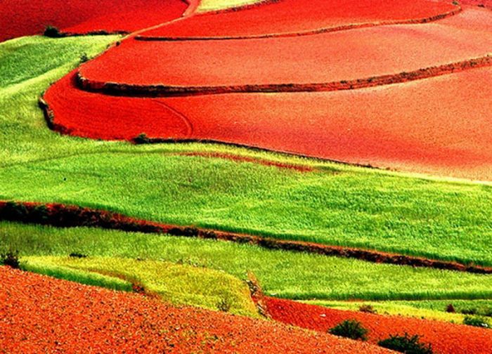 東川紅土地位於昆明市東川區西南40多公里的新田鄉、一個叫「花石頭」(在109公里里程碑處)的地方,這裡方圓近百里的區域是雲南紅土高原上 最集中、最典型、最具特色的紅土地,被專家認為是全世界除巴西里約熱內盧外最有氣勢的紅土地,而其景象甚至比巴西紅土地更為壯美。第一眼看到那極具層次的 彩色線條,相信你會和我一樣,會覺得美得太不真實了!