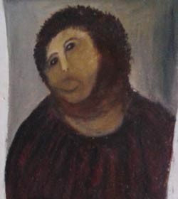 壁畫會隨著時間逐漸斑駁,西班牙一名80多歲的老太太看到教堂牆上的畫作剝落嚴重,未經過政府授權、也沒有經教堂同意,竟然擅自動手修復那幅畫,結果原本一幅120年歷史的荊冠耶穌像,由她經手後變得像史前人猿,當地民眾除了傻眼外,不知道該做何反應。