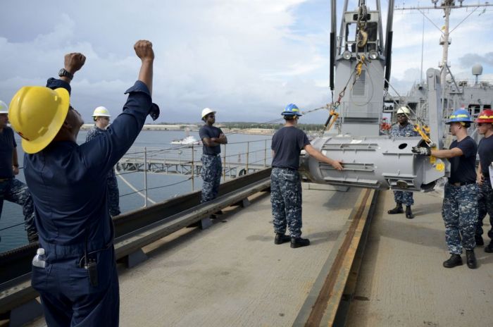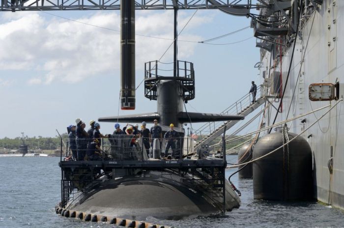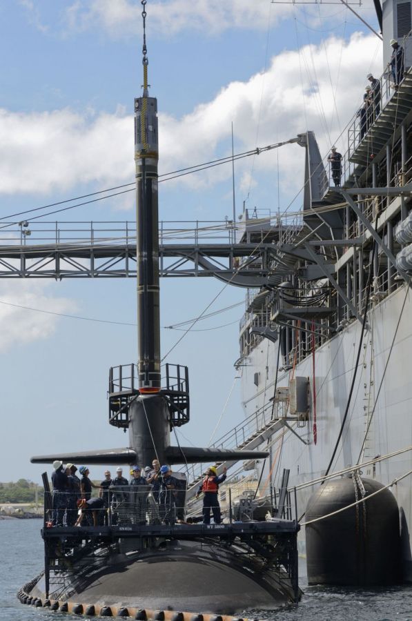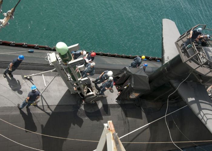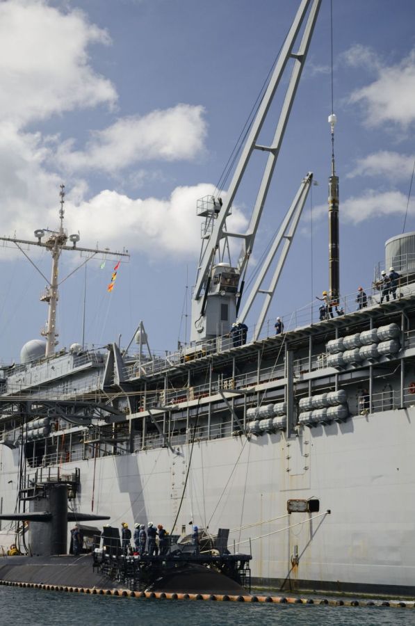2012年11月16日,關島基地,美國海軍AS40潛艇母艦正在為奧克拉荷馬號SSN-723核子攻擊潛艇補充戰斧巡弋飛彈與MK48魚雷。