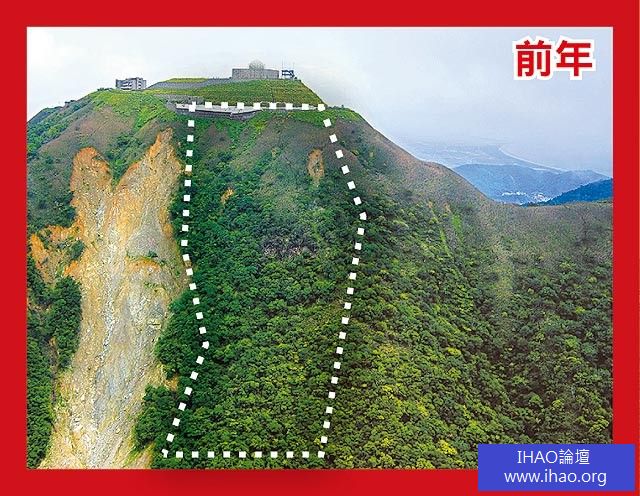 二○一一年東澳嶺雷達站(箭頭處)周邊已有明顯的土石坍方(圖四),虛線框內仍未崩坍,但《蘋果》前天透過空拍,發現該區域已坍塌