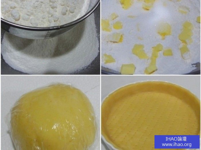 1低粉過篩加入糖、鹽、室溫稍微軟化的切丁奶油塊,用手搓成小結球狀態,加入鮮奶揉成麵糰,保鮮膜包住冷藏四小時(至少一小時),取出橄圓,放在烤盤(我的18公分)上,中間用叉子搓洞,預防烤的時候膨脹,醒20分鐘(沒醒烤後會內縮)。