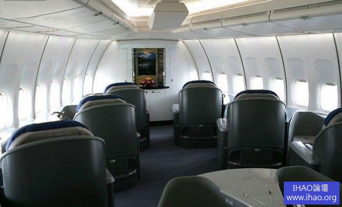 頭等艙:下層客艙中段,隨行的重要部門官員一般坐在中段,這裡在專機任務時會稍作改裝,偶爾也會在這裡開個圓桌會議,隨機的空姐會來提供服務(專機上,聽說空姐是不允許進前艙的)