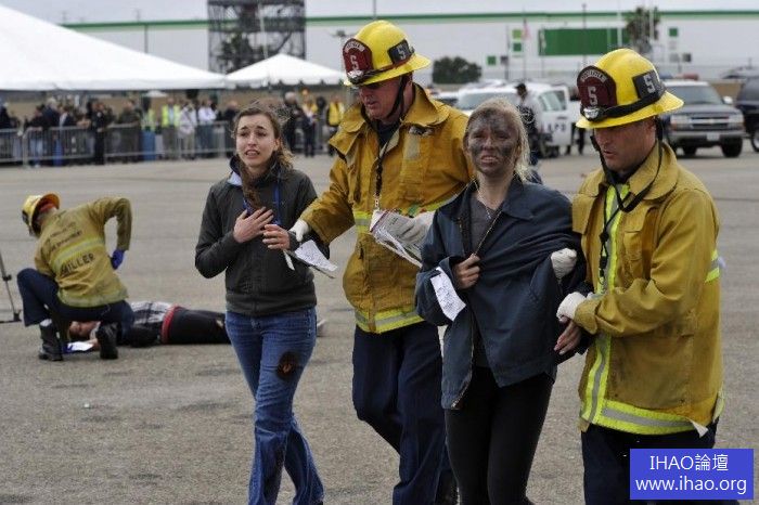 當地時間4月24日,美國洛杉磯國際機場舉行演習,模擬一架飛機失事,消防人員對眾多「遇難者」進行營救。這個由美國聯邦航空局聯合警方、消防員的演習每三年至少舉辦一次,旨在增強各方對緊急事件的反應速度和營救技巧