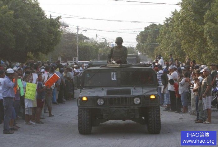 當地時間5月20日 墨西哥一處小鎮迎接軍方人士 在此之前此村莊一直被毒販控制